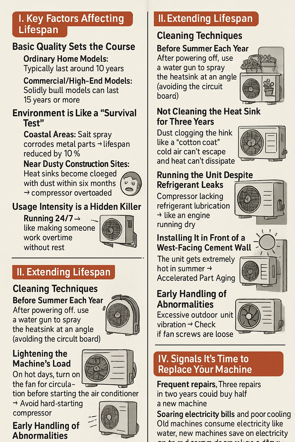 Tulad ng iba pang mga kasangkapan sa sambahayan, ang habang buhay ng isang air conditioner condenser ay hindi naayos, ngunit ang pang -araw -araw na gawi sa paggamit at pagpapanatili ay matukoy kung gaano katagal ito maaaring tumagal. Narito ang mga pangunahing punto: